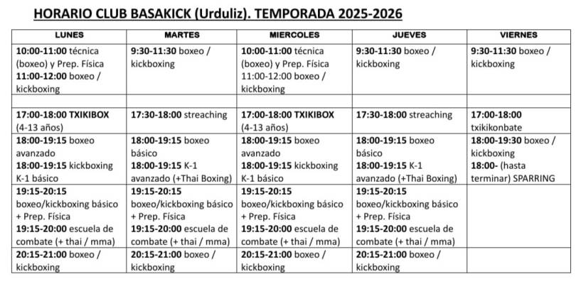Imagen horario basakick 2025-2026