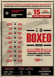 E l 15 DE ENERO EN EL CLUB DEPORTIVO DE BILBAO, se han celebrado las finales de los campeonatos de Bizkaia de boxeo. Importante asistencia de publico, segun dicen alrededor de 1.000 personas. Hubo algunos combates que por lesion,… no se pudieron celebrar, con lo que se dio vencedor por WALK OVER (W.O.) al otro finalista.
