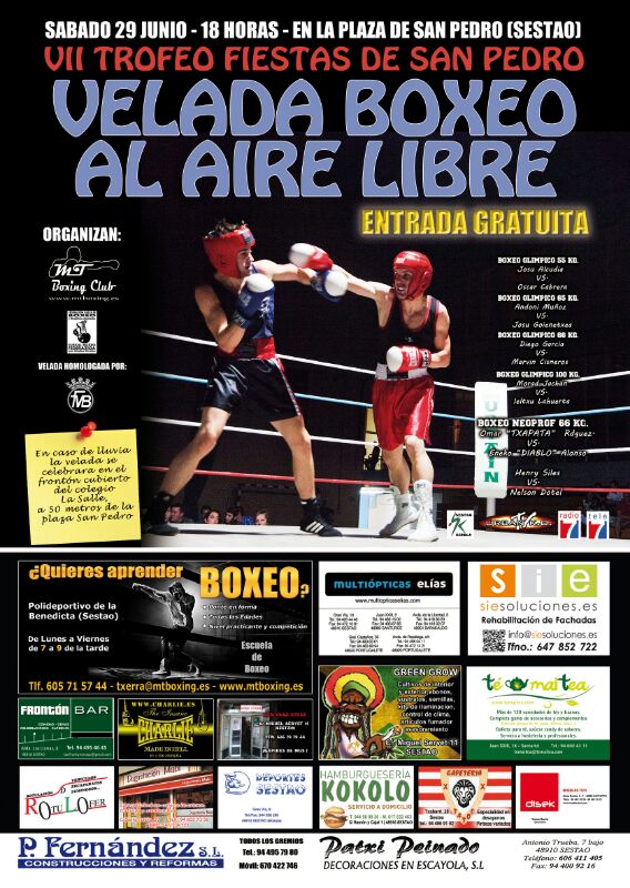 Orden de combates, 29 de Junio en la velada de las fiestas de Sestao (VII TROFEO FIESTAS DE SAN PEDRO). Participan del club Diego Valtierra, Mikel Sortino y Omar Rodriguez «Txapata»